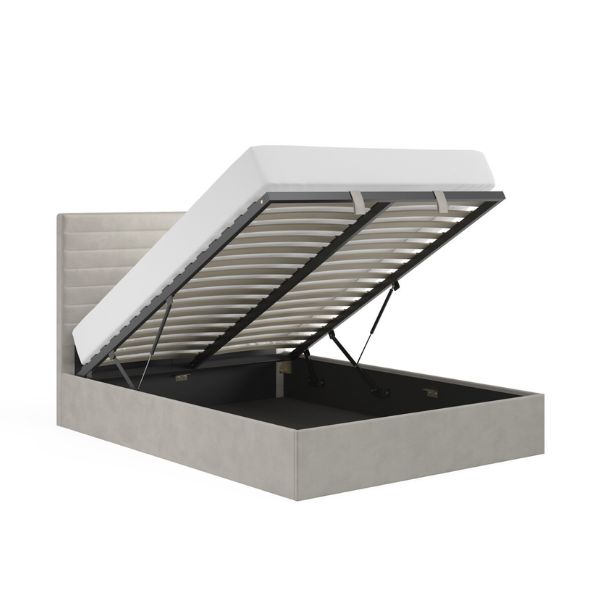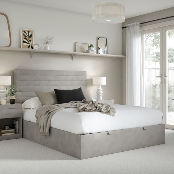 Upgrade your bedroom with the Tamara Ottoman Bed Frame. It features a stylish horizontal-stitched headboard, plush grey velvet upholstery, and a supportive sprung slatted base. The Tamara bed offers both luxury and functionality. Enjoy ample storage space with the ottoman base.